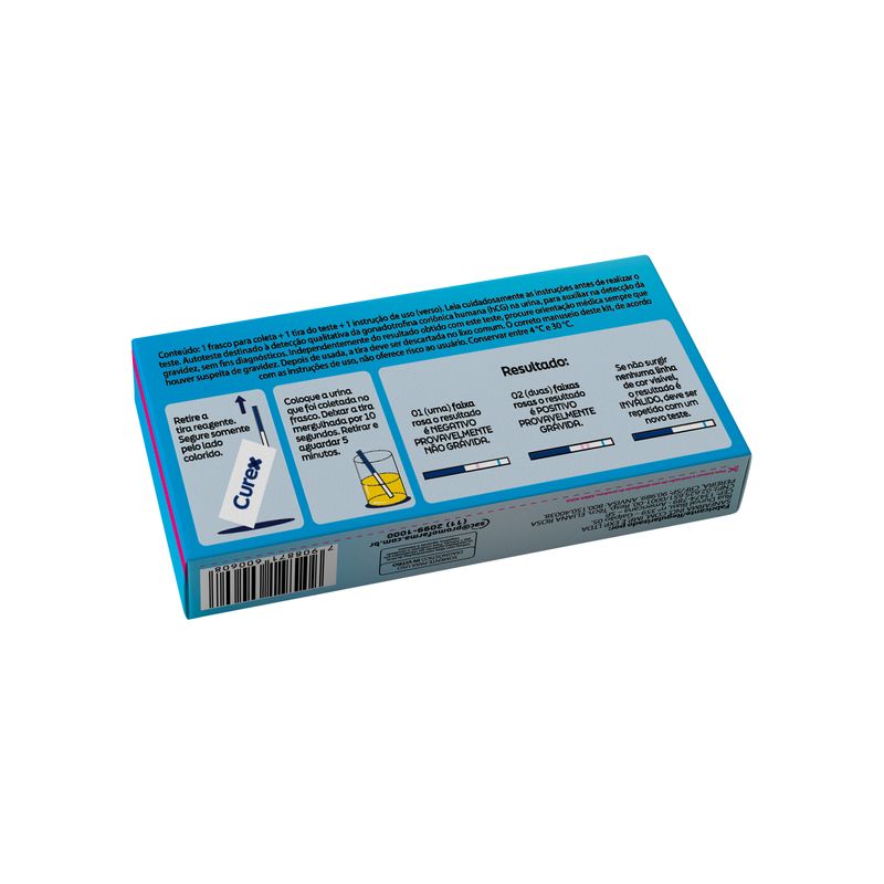 As instruções de uso estão descritas no verso e parte interna da embalagem do Teste de Gravidez Curex.