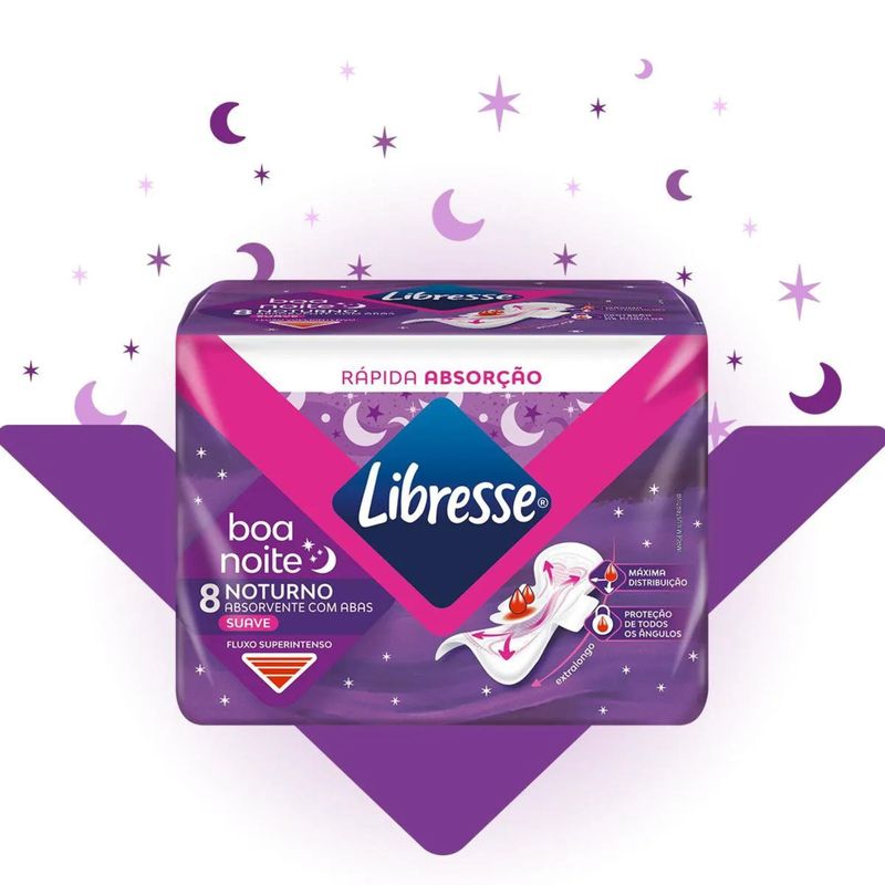 O Absorvente Noturno Libresse Boa Noite Suave com Abas (8 unidades) foi desenvolvido para oferecer proteção reforçada durante o sono, ajudando a reduzir o risco de vazamentos em diferentes posições. Com formato noturno e maior área de cobertura, é uma opção indicada para quem busca mais segurança em noites de fluxo moderado a intenso. A cobertura suave contribui para uma sensação mais confortável em contato com a pele, enquanto as abas ajudam a manter o absorvente bem fixo na calcinha, melhorando o ajuste e a estabilidade ao longo da noite.