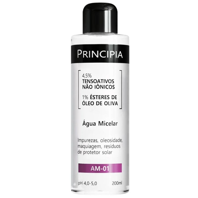 Apresentada em frasco de 200ml, a Água Micelar Principia AM-01 tem textura fluida, leve e refrescante, de rápida absorção e que não deixa resíduo oleoso. Pode ser utilizada pela manhã e à noite, tanto como primeiro passo de limpeza quanto para remover maquiagem ao final do dia. É adequada para diferentes tipos de pele, inclusive peles sensíveis, quando usada conforme orientação do fabricante, proporcionando uma limpeza prática e sem necessidade de enxágue em muitas rotinas.