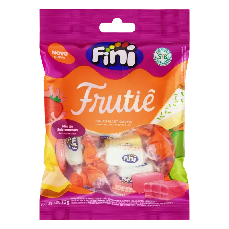 Uma Fini+Vegana que você nunca viu, será? E se eu contar que Frutiê vai te surpreender? A nossa primeira bala vegana, certificada pela Sociedade Vegetariana Brasileira, é incrivelmente cremosa, macia e com um sabor indescritível de Morango, Lima- Limão, Laranja e Abacaxi. Um verdadeiro mix de sabor! Você não vai conseguir comer uma só!