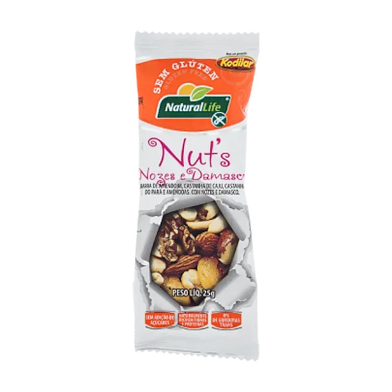 A barrinha de Nut’s da Natural Life Nozes e Damasco é uma excelente opção para o consumo entre os lanches intermediários, pelo sabor e por suas propriedades funcionais. É rica em boas fontes de gorduras provenientes do amendoim e das oleaginosas, que contribuem para o bom funcionamento do organismo e da saúde cardiovascular. Possui vitaminas, sendo que a noz é a oleaginosa com maior teor de vitamina E (ação antioxidante), minerais, fibras e proteínas.