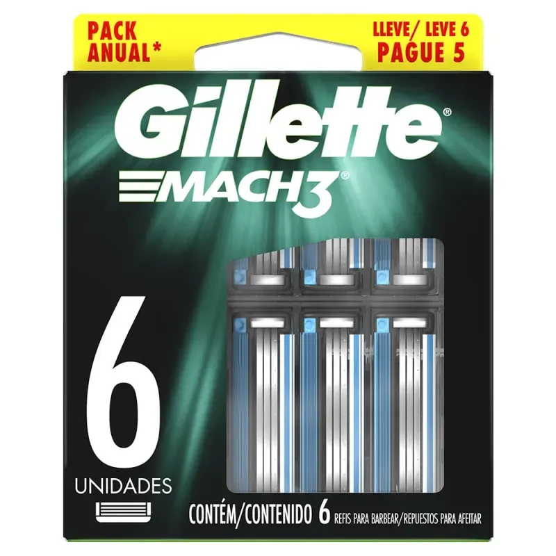 Carga Para Aparelho de Barbear Gillette Mach3 Refil Com 6 Cartuchos conta com três lâminas que cortam o pêlo com suavidade, ao mesmo tempo em que sua cabeça móvel e seus dez micros tensores proporcionam um barbear mais rente e com menos passadas. E o melhor é que dura duas vezes mais que o aparelho descartável líder de mercado. Lâminas mais resistentes que o aço e que se mantêm afiadas por mais tempo. Cabeça flexível que se ajusta ao contorno do rosto e molas independentes que distribuem a pressão nas lâminas, proporcionando um barbear confortável e rente. Os micros tensores esticam a pele antes do passar das lâminas, para um barbear ainda mais rente.Apresentação