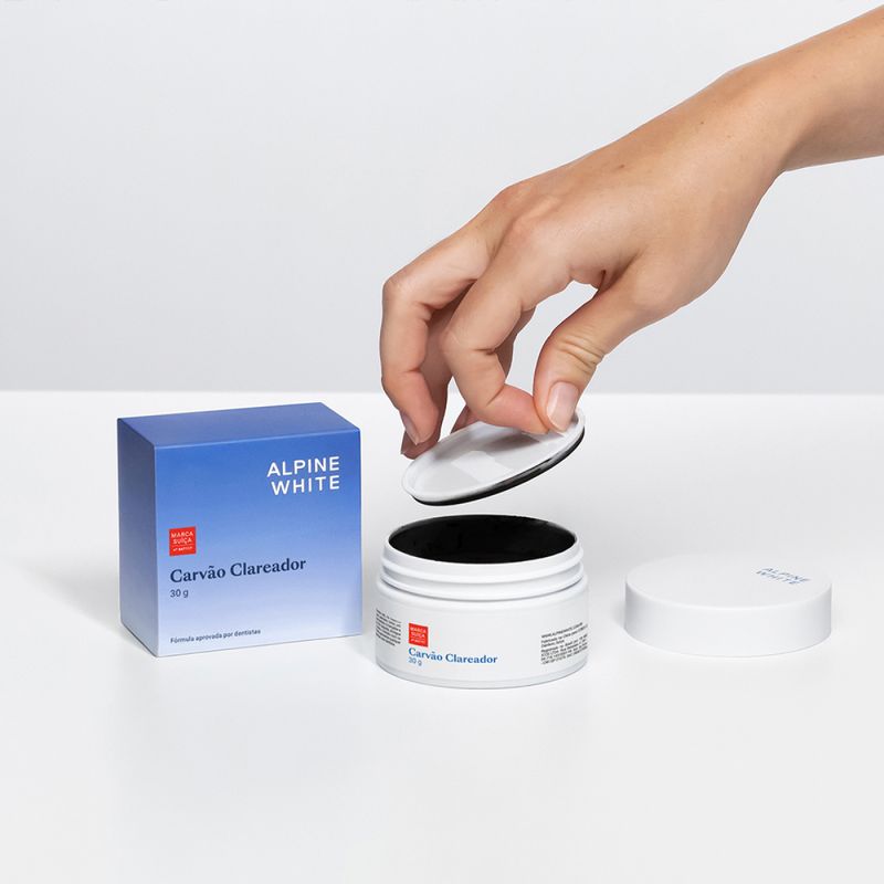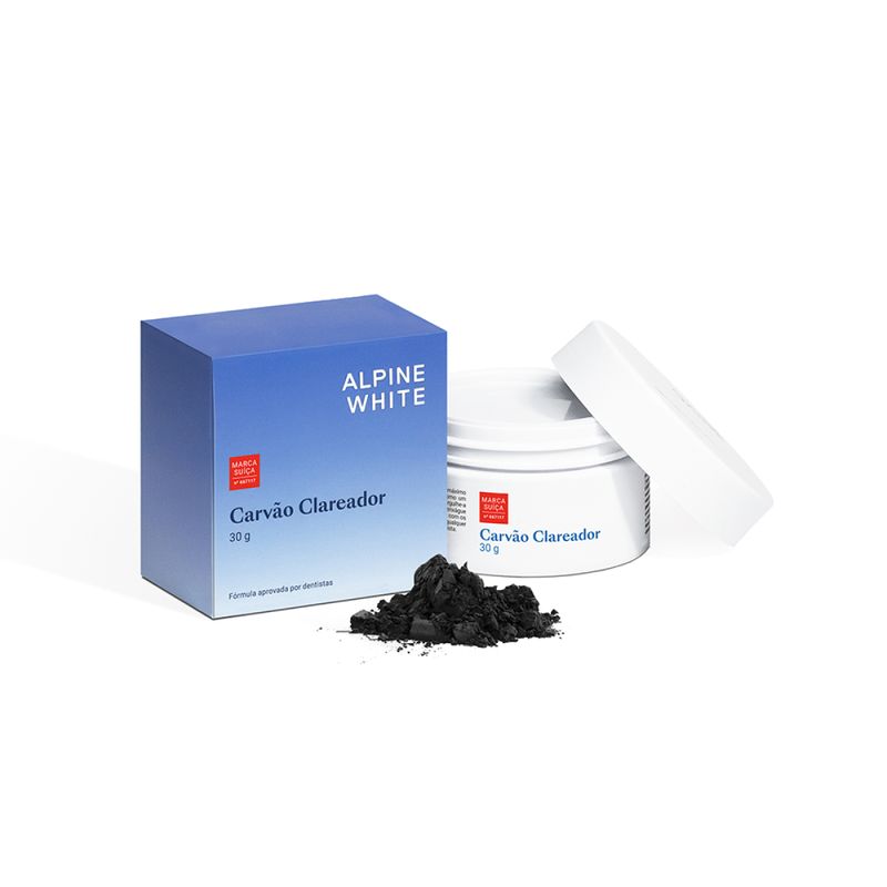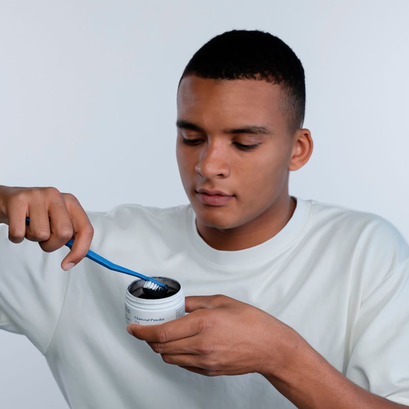Dentes naturalmente brancos. O carvão ativado é um pó fino produzido a partir do carbono. Sua estrutura levemente granulada é ideal para remover manchas e descolorações causadas pelo consumo de alimentos que contenham pigmentos como café, chá, curry ou tabaco.