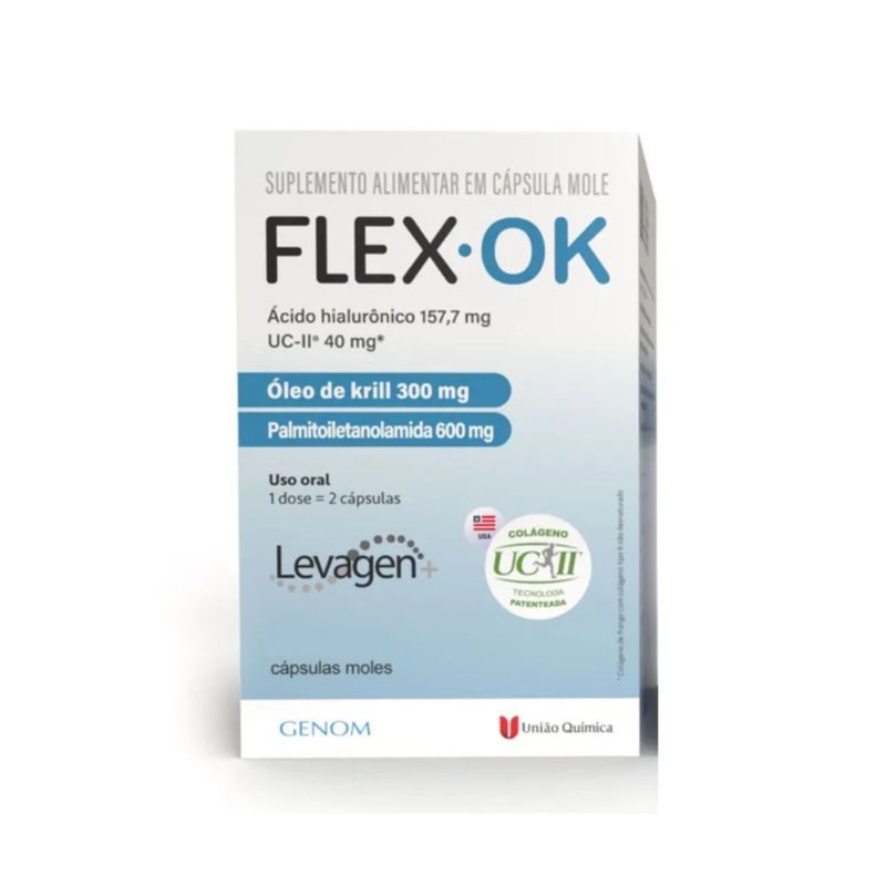 Flex Ok é um suplemento alimentar em cápsulas moles à base de colágeno UC-II, Ácido Hialurônico, Óleo de Krill e Palmitoiletanolamida. Sua fórmula ajuda na manutenção da saúde da cartilagem e redução da inflamação e auxilia na melhora da dor nas articulações e fortalecimento dos músculos.