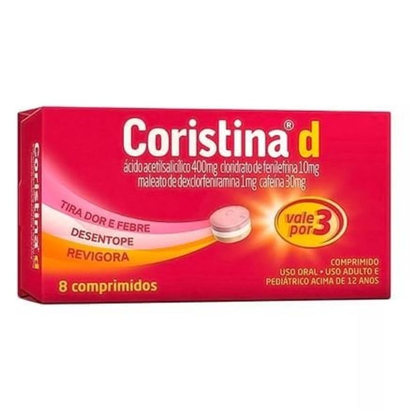 Coristina D é indicada no tratamento dos sintomas do resfriado comum e da gripe (dor de cabeça, dor no corpo, febre, coriza, espirros e obstrução nasal). Coristina D é uma associação medicamentosa que combina a ação analgésica e antipirética do ácido acetilsalicílico, com a ação antialérgica do maleato de dexclorfeniramina, eficaz na coriza e espirros, com cloridrato de fenilefrina, eficaz no alívio da obstrução nasal e a ação revigorante da cafeína. A inclusão da cafeína tem por função compensar a sonolência que pode ocorrer com o componente anti-histamínico.