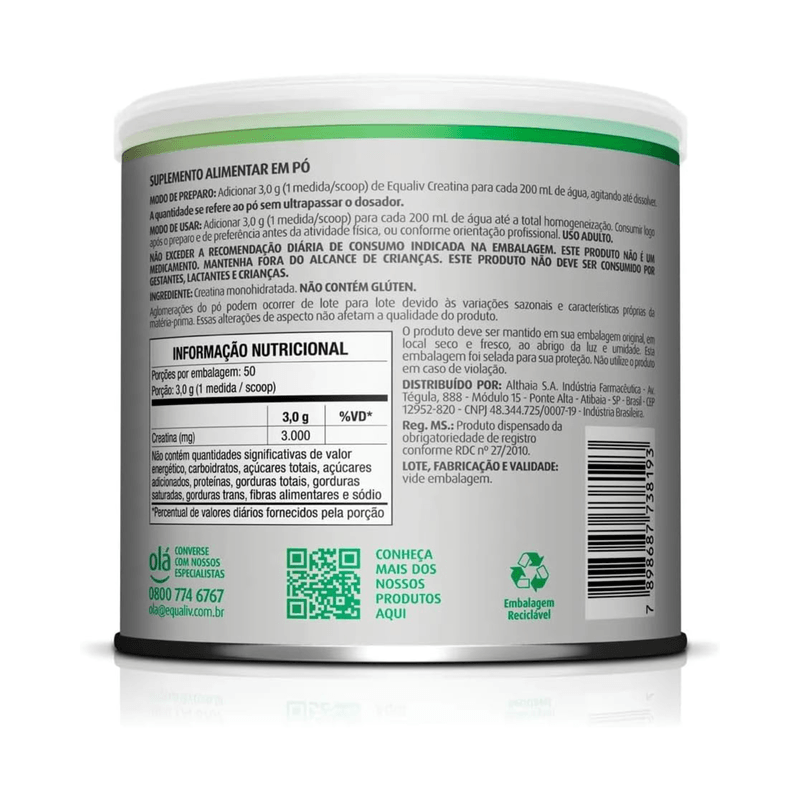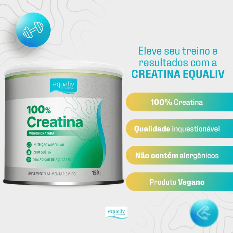 Creatina Equaliv Monohidratada 150g é um suplemento alimentar formulado para complementar a ingestão de creatina monohidratada. Indicado para adultos, combina creatina em pó sem sabor em pote de 150 g, contribuindo para o suporte energético em exercícios de alta intensidade e curta duração e para a padronização da rotina de treino dentro de um estilo de vida equilibrado.