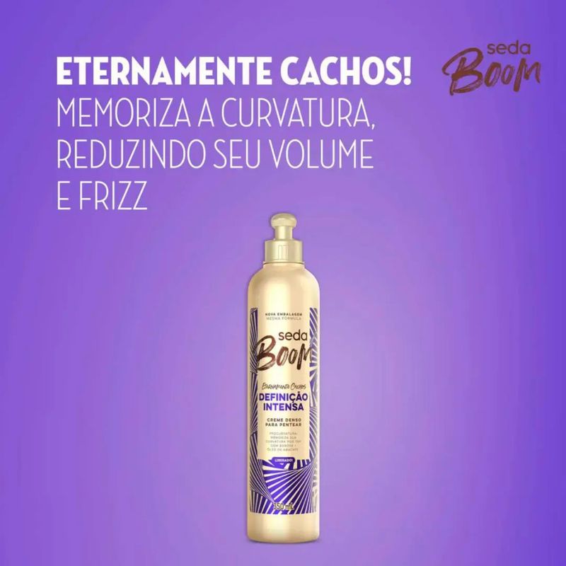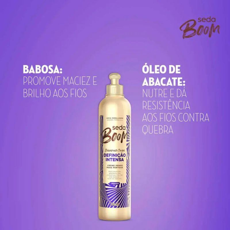 O novo Creme para Pentear Seda Boom Definição Intensa une a tecnologia ProCurvatura com ingredientes da natureza como Babosa e Óleo de Abacate, para definir sua curvatura por 72 horas e manter seus cachos hidratados e livres do frizz por mais tempo. Além disso, possui fórmula liberada, ótimo para usar também no Day After (nos dias posteriores à lavagem e finalização).Benefícios
