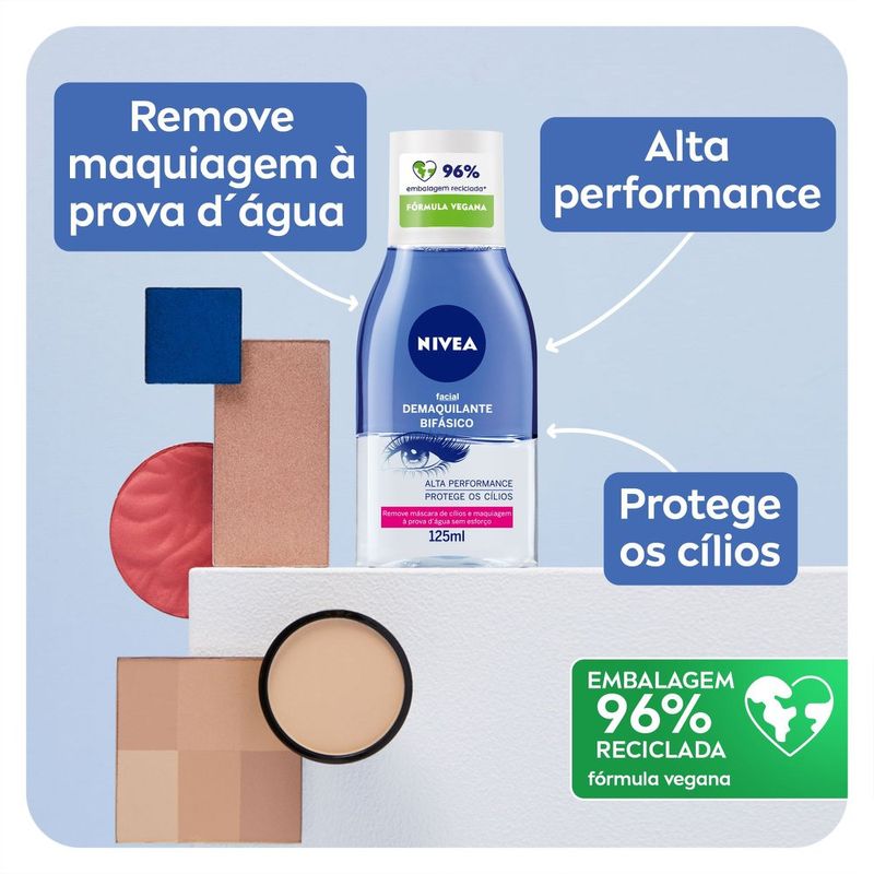 Indicado para remoção de maquiagem a prova d’água, o Nivea Demaquilante Bifásico remove máscara para cílios, lápis de olhos e delineadores sem esforço e sem deixar resíduos. Sua fórmula conta com uma fase de água e uma fase de óleos, incluindo o de girassol, rico em vitaminas e ativos que auxiliam na saúde da pele. Quando misturados, os dois viram um poderoso demaquilante para todo o rosto, em especial a área dos olhos. É adequado para quem usa lentes de contato.
