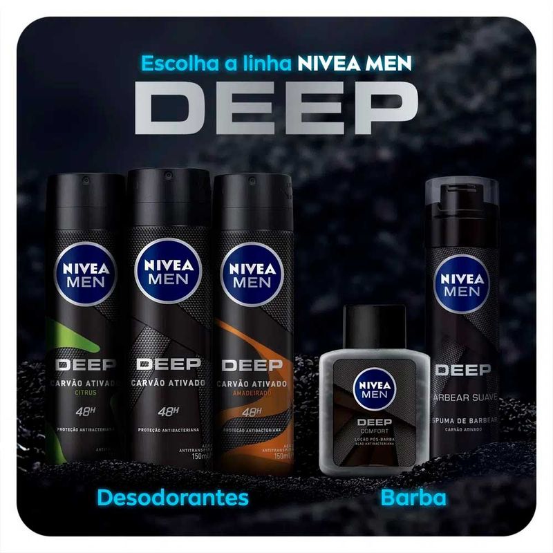 NIVEA MEN DEEP Antitranspirante com proteção de 48hrs, proporcionando uma sensação duradoura de pele limpa e seca, exatamente como após o banho. Sua fórmula eficaz com Carvão Ativado atua poderosamente contra bactérias e propociona uma fragrância refrescante com notas de gengibre e Sandalwood. O poder do carvão ativado em uma fragrância masculina de longa duração; Sensação de frescor e limpeza; Proteção antitranspirante eficaz por até 48h; Dermatologicamente testado