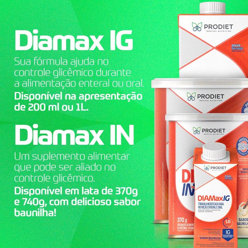baixo índice glicêmico e composição balanceada que auxilia no controle dos níveis de glicose no sangue, sem comprometer o aporte de nutrientes essenciais. Sua fórmula contém proteínas de alto valor biológico, gorduras de origem vegetal, carboidratos de absorção lenta e fibras solúveis que ajudam na manutenção da saciedade e no bom funcionamento intestinal. O Diamax IG Baunilha é uma opção segura e eficaz para o suporte nutricional oral ou enteral, garantindo energia estável, melhor controle metabólico e sabor agradável.