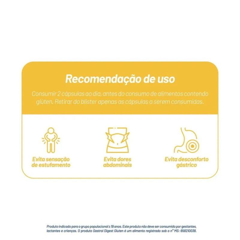 Ingerir 2 cápsulas ao dia, antes do consumo de alimentos contendo glúten.