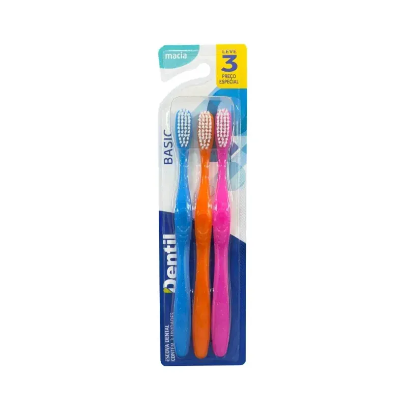 A Escova de Dentes Dentil Basic Macia Pack 3 Unidades é um kit de escovas dentais desenvolvido para a higiene oral diária. Possui cerdas macias que promovem limpeza eficiente, removendo placa bacteriana e resíduos alimentares sem agredir as gengivas, além de oferecer praticidade em uma embalagem econômica com 3 unidades.Para que serve?
