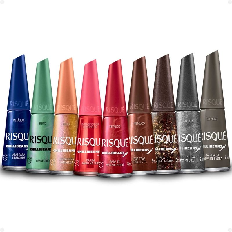 O que é? Esmalte metálico da coleção Risqué + Chilli Beans com cor intensa e acabamento luminoso.