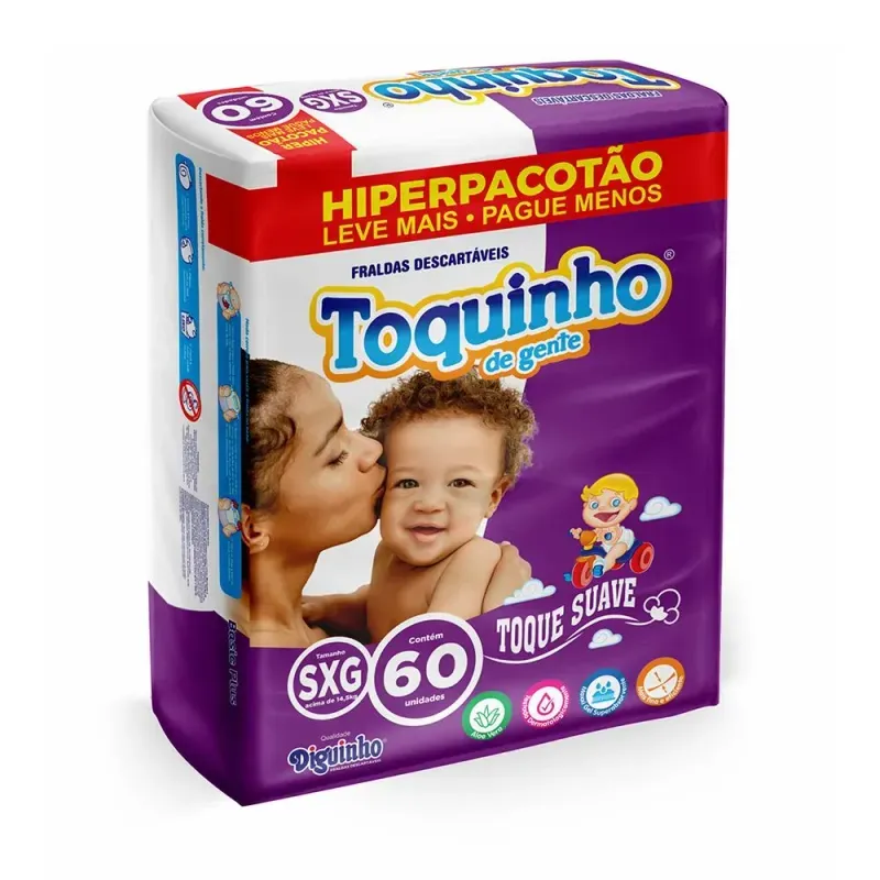 A Fralda Descartável Toquinho de Gente SXG 60 Unidades é uma fralda infantil desenvolvida para proporcionar proteção prolongada e conforto para bebês de tamanho Super XG. Oferece alta absorção e barreiras antivazamento, mantendo a pele seca e protegida por mais tempo.Para que serve?