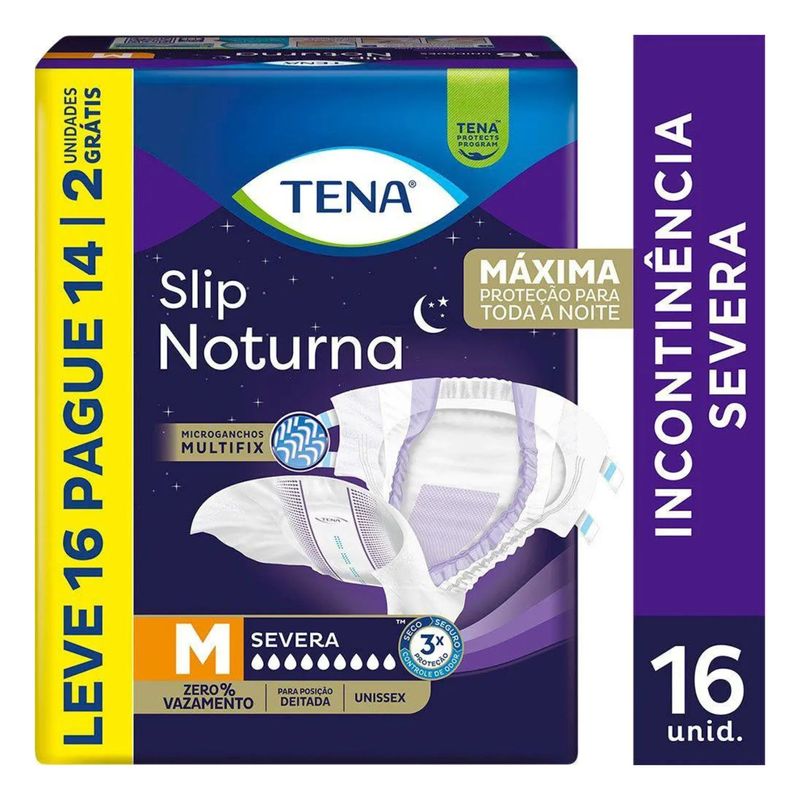 O que é? Fralda geriátrica noturna tipo slip, tamanho M, com 16 unidades.