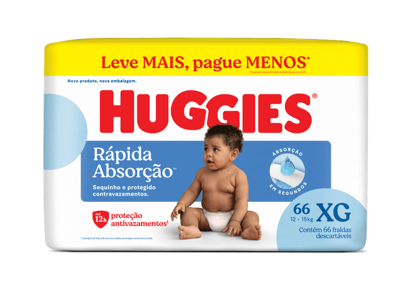 O que é? Fralda descartável Huggies Rápida Absorção tamanho XG em pacote econômico com 66 unidades.