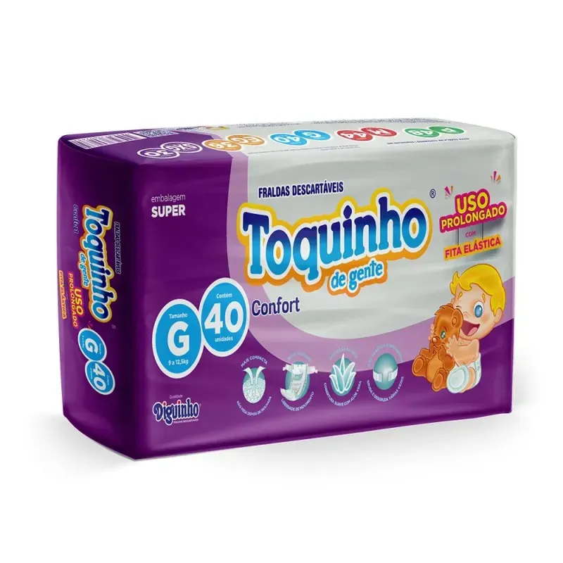 A Fralda Infantil Toquinho de Gente Confort Sec tamanho G 40 Unidades é uma fralda descartável projetada para oferecer conforto, proteção e praticidade. Desenvolvida com materiais suaves e tecnologia de absorção eficiente, mantém a pele do bebê sempre seca, prevenindo assaduras e garantindo bem-estar durante o dia e a noite.Para que serve?