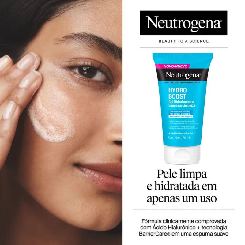 Em embalagem de 150ml, o Neutrogena Hydro Boost é indicado para todos os tipos de pele, inclusive mista e oleosa, que costumam sofrer com limpeza que resseca demais. A fórmula é leve, de rápida espuma e fácil enxágue, sem deixar sensação pegajosa ou de repuxamento. Pode ser usado de manhã e à noite como primeiro passo da rotina de cuidados, preparando a pele para receber séruns, hidratantes e protetor solar.