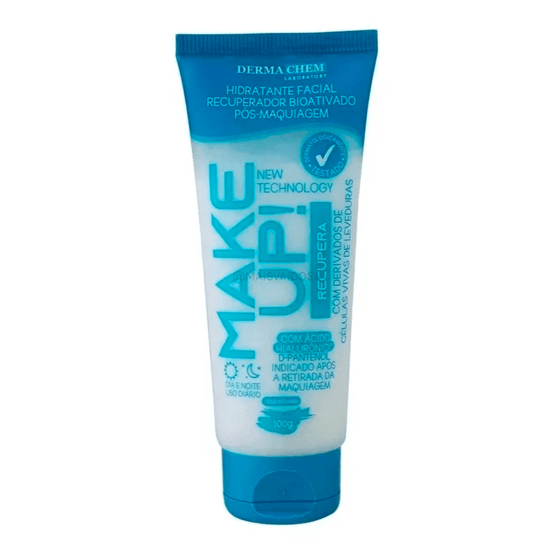 O HIDRATANTE FACIAL RECUPERADOR BIOATIVADO PÓS- MAQUIAGEM MAKE UP RECUPERA DERMACHEM LABORATORY foi desenvolvido para recuperar a hidratação natural da pele após remoção da maquiagem. Contém peptídeos oriundos de células vivas de levedura, combinado com Ácido Hialurônico e D-Pantenol, que agem como umectantes bioativado de dentro para fora. Uma combinação PERFEITA! Pode ser utilizado no dia a dia como hidratante facial diurno e noturno, não necessariamente após a maquiagem. Sua tecnologia inovada faz com que ao ser absorvido pelas camadas da pele, ative a absorção de água, ácido hialurônico e D-Pantenol para manutenção hidratação, melhorando assim a oxigenação e o estímulo da síntese de colágeno, o que causa o efeito translucente. Seja bem- vinda ao mundo tecnológico Make Up Recupera da Dermachem Laborator. New Technology!