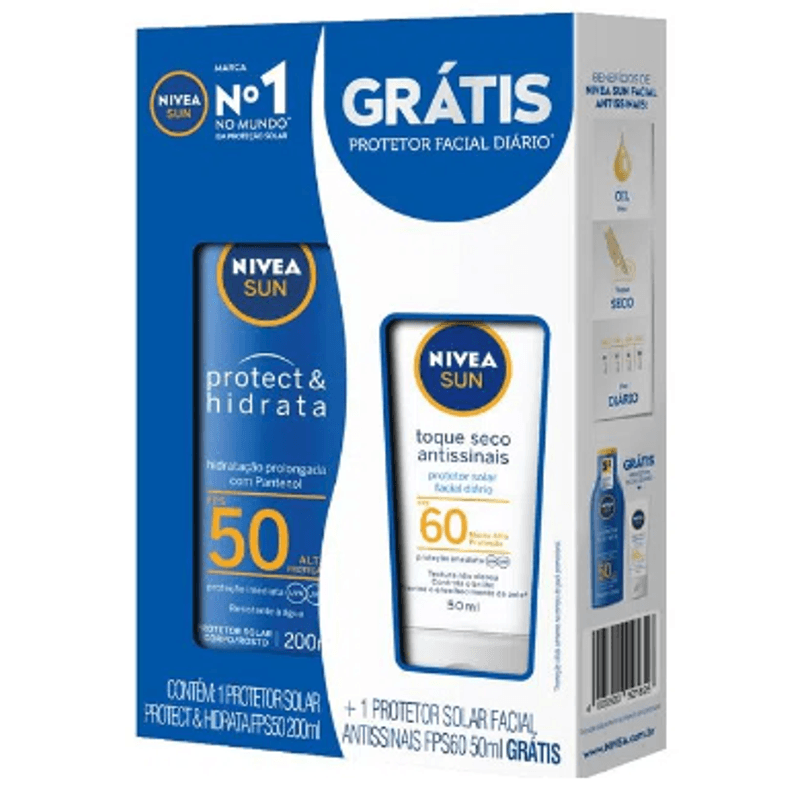 Para que serve: Nivea Sun Protect & Hidrata possui um sistema de filtro UVA/UVB que oferece muito alta proteção imediata e previne o envelhecimento da pele causado pela exposição solar/radiação. O novo Nivea Sun Beauty Expert FPS50 protege contra os raios UVA/UVB e tem fórmula hidratante de toque seco, que controla a oleosidade e promove efeito matte.