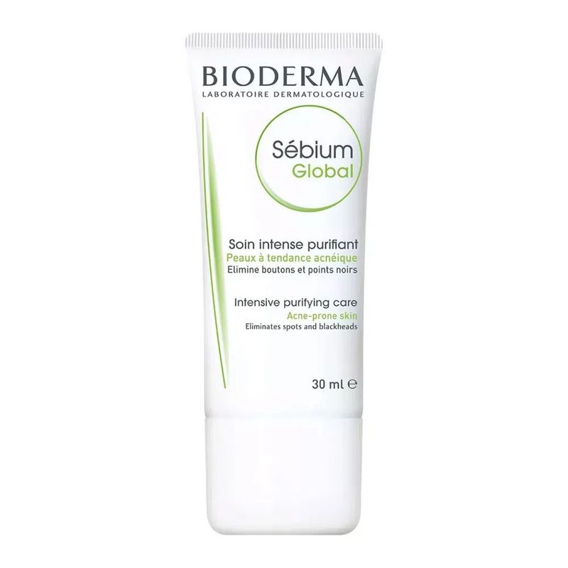 Sébium Global é formulado especificamente para que a pele propensa a acne agindo biologicamente nas causas (1) e consequências (2) de lesões graves: 1- a combinação patenteada original de Bakuchiol e a patente Fluidactiv ™ reequilibra biologicamente a composição do sebo 2- a combinação de ativos dermatológicos doseados adequadamente - ésteres de AHA, ácido salicílico e ácido cítrico - limpa os poros e suaviza a textura da pele. Enoxolona acalma a pele e reduz a vermelhidão. Gluconato de zinco regula o brilho. A glicerina hidrata a pele para garantir conforto.