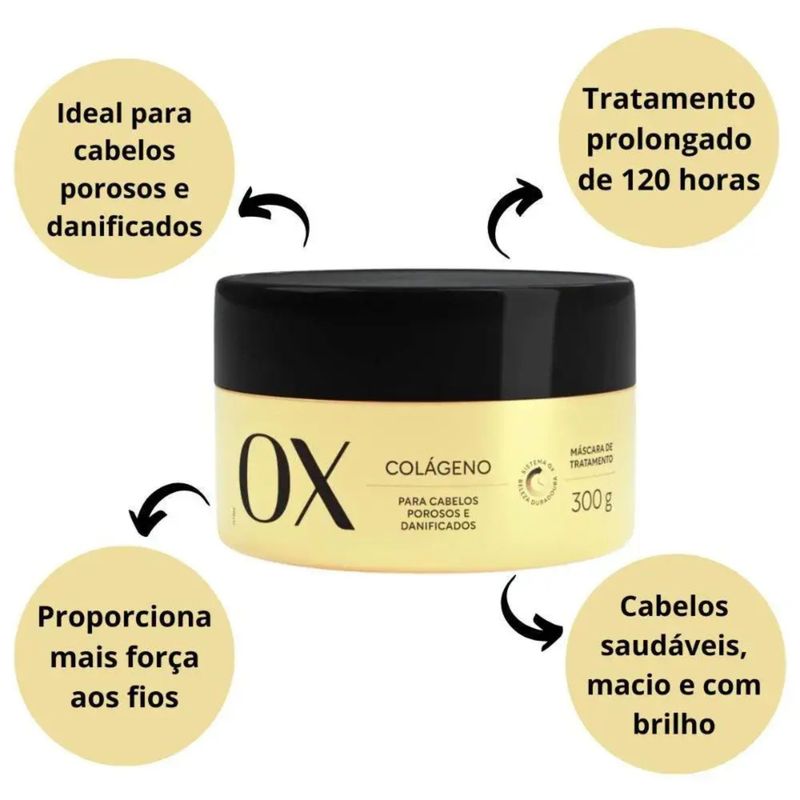 A máscara Ox Colágeno é indicada para qual tipo de cabelo? É indicada para cabelos fracos, danificados ou sem vida, podendo ser usada em diferentes tipos de cabelo.