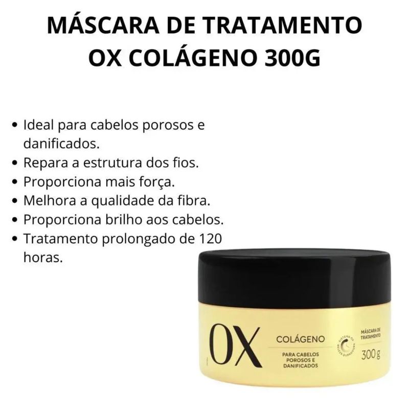 Com embalagem de 300g, a Máscara Ox Colágeno possui textura cremosa e fácil de espalhar, garantindo aplicação uniforme no comprimento e pontas dos cabelos. Indicada para uso semanal ou conforme a necessidade dos fios, ela auxilia na recuperação da estrutura capilar sem pesar. Desenvolvida pela Ox Cosméticos, a máscara é indicada para diversos tipos de cabelo, especialmente aqueles que precisam de fortalecimento, hidratação e revitalização.