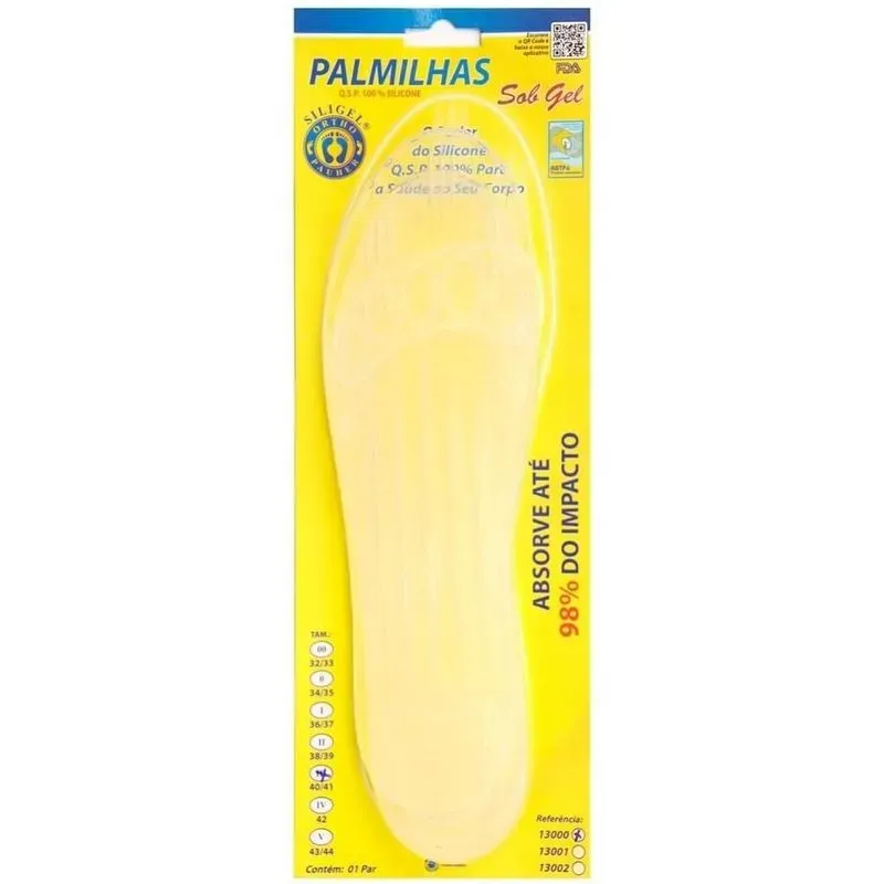 As Palmilhas Sob gel são desenhadas com ranhuras na parte inferior, que auxiliam na dissipação da energia gerada pelo impacto, fazendo com que no momento do choque, haja uma absorção e logo em seguida uma propulsão do impacto do pisar. Seu ajuste anatômico é perfeito, adaptando-se aos mais variados tipos de sapatos. As Palmilhas Sob-Gel são fabricadas com Q.S.P. 100% Silicone. Sua formulação tem características especificas, o que confere sua indicação na ortopedia e prática de esportes. O poder de silicone para saúde do seu corpo.