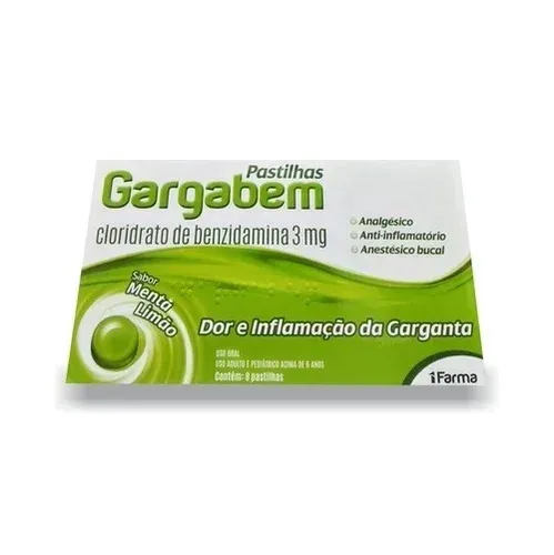 Gargabem Pastilha 3mg é um medicamento indicado para o alívio dos sintomas de irritação e inflamação na garganta. Apresentado em embalagem com 8 pastilhas, oferece uma ação local rápida para confortar a garganta irritada.Para que serve?