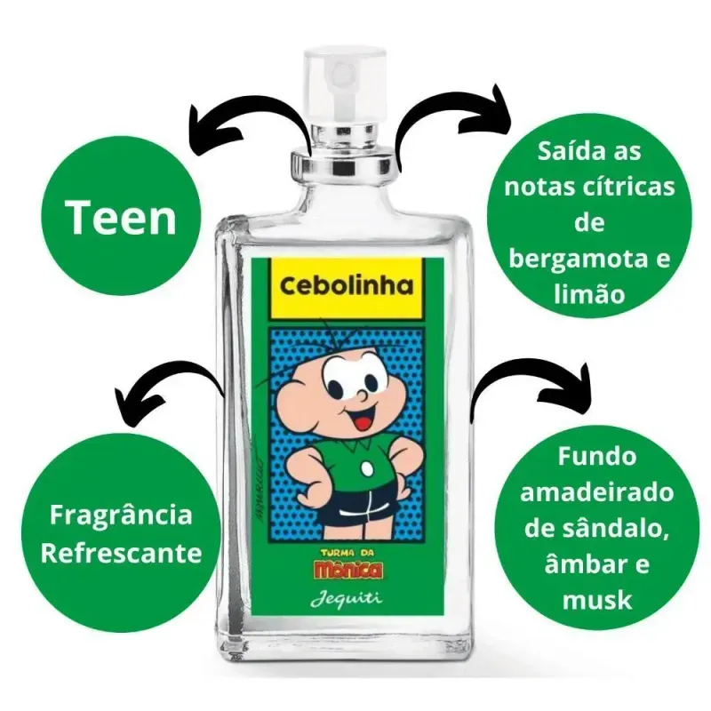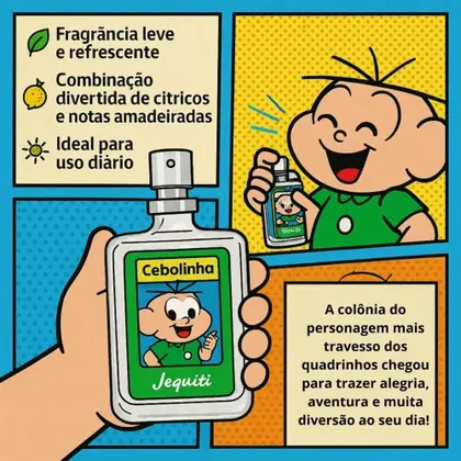 Perfume Cebolinha Jequiti Turma da Mônica 25ml é uma fragrância infantil desenvolvida especialmente para crianças, inspirada no personagem Cebolinha da Turma da Mônica. Com notas suaves, alegres e delicadas, é ideal para o dia a dia, proporcionando frescor e bem-estar sem agredir a pele sensível dos pequenos.