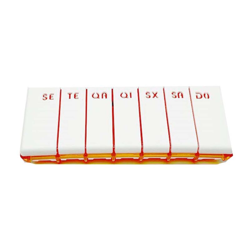 Porta-comprimidos com 7 compartimentos para organizar a medicac¸a~o semanal, de tomada dia´ria u´nica ou mu´ltipla. Organiza a medicac¸a~o de forma discreta e funcional, assegurando a tomada correta do tratamento prescrito reduzindo riscos de falhas, de esquecimentos e de duplas tomadas.