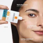 A fórmula inclui filtros solares fotostáveis para ampla proteção UVA/UVB, e ativos dermocosméticos como Ácido Hialurônico (hidratante) e Niacinamida (uniformização do tom da pele). A textura é descrita como fluida, leve e com toque seco, o que sugere presença de silicones leves ou polímeros para acabamento toque seco (detalhes exatos dos filtros ou excipientes dependem da tabela de composição no rótulo).Resumo