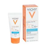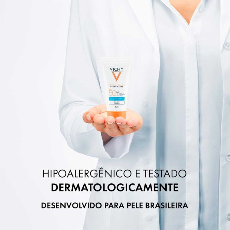 O protetor solar facial da Vichy protege contra os raios UVA, sem deixar brilho residual, deixando um efeito matte por até 12 horas, hidratando sem pesar. Satisfação e eficácia garantida por especialistas em textura e pacientes brasileiras com pele mista a oleosa. O Hydra-matte é resistente à água e possui alta proteção com o FPS50 e PPD 24 que protege a pele contra a radiação UVA.