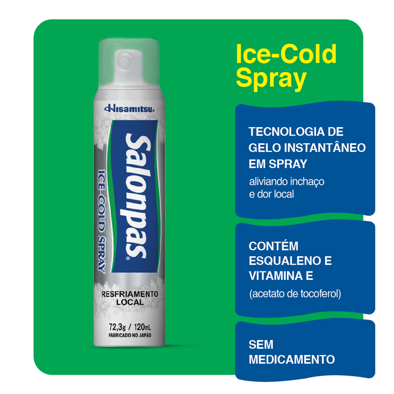 Spray sem medicamento, com efeito gelado que substitui a bolsa de gelo de forma mais prática, aliviando o inchaço e a dor; É de fácil aplicação; Contém esqualeno e vitamina E; Seca rapidamente e não deixa resíduo na pele;