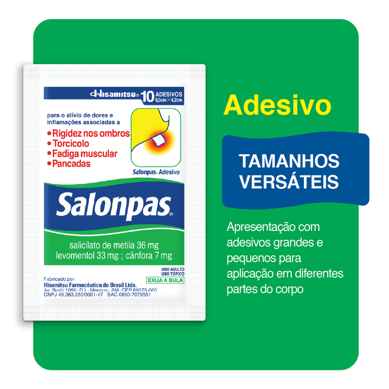 Salonpas Adesivo é um analgésico, anti-inflamatório de uso tópico, que age sobre a região afetada, aliviando a dor e o inchaço. Salonpas Adesivo também pode ser utilizado para tratar outras condições determinadas por um médico.