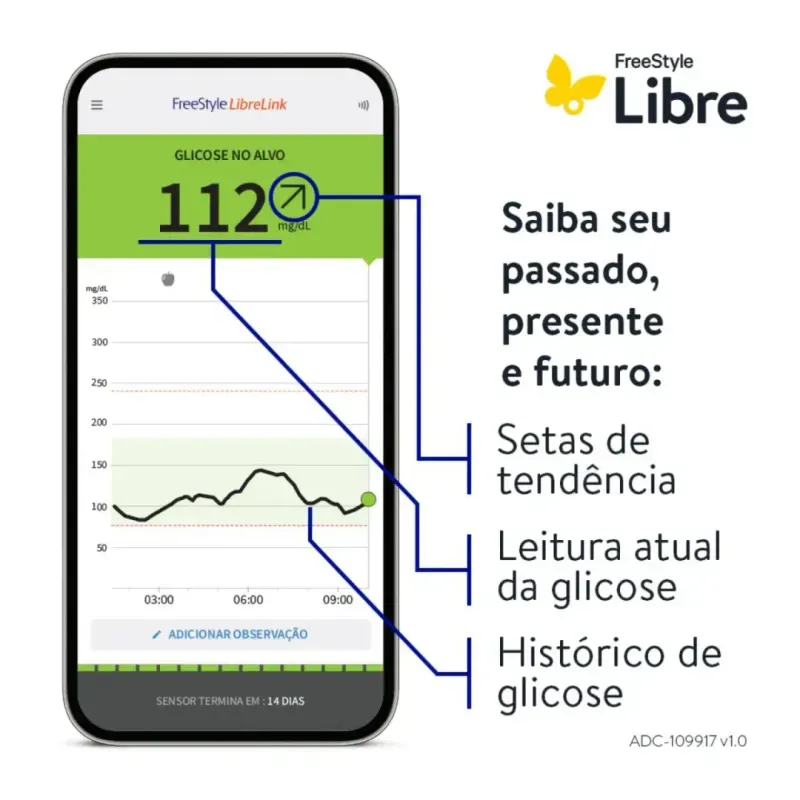 Aplicado na parte de trás do braço, o sensor realiza leituras contínuas da glicose no líquido intersticial e permite que o usuário verifique seus níveis em apenas um segundo, sem a necessidade de picadas constantes no dedo.