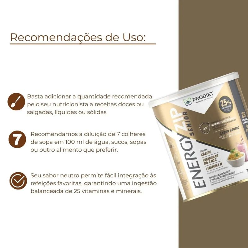 Cada embalagem contém 740g do Suplemento Alimentar Energyzip Senior em pó, pronto para preparo. O produto é fonte de proteínas de alto valor biológico, carboidratos, fibras, vitaminas A, C, D, E, K e complexo B, além de minerais como cálcio, ferro, zinco, magnésio e selênio. Esses nutrientes auxiliam na manutenção da força muscular, da imunidade e da saúde óssea. Pode ser utilizado como complemento entre as refeições ou conforme orientação médica ou nutricional. Energyzip Senior é indicado para adultos a partir de 50 anos que desejam manter uma nutrição equilibrada e adequada às suas necessidades diárias.