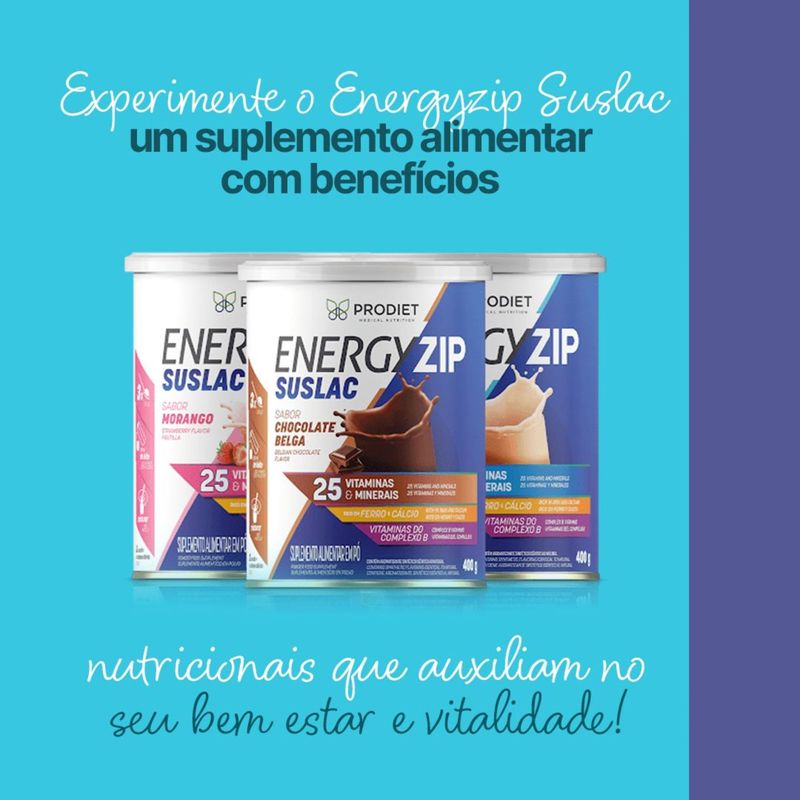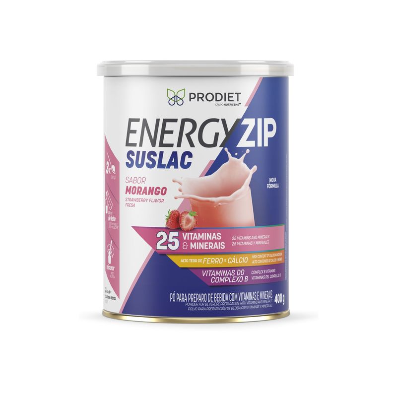 Cada embalagem contém 400g do Suplemento Alimentar Energyzip Suslac sabor Morango em pó, pronto para preparo. O produto é