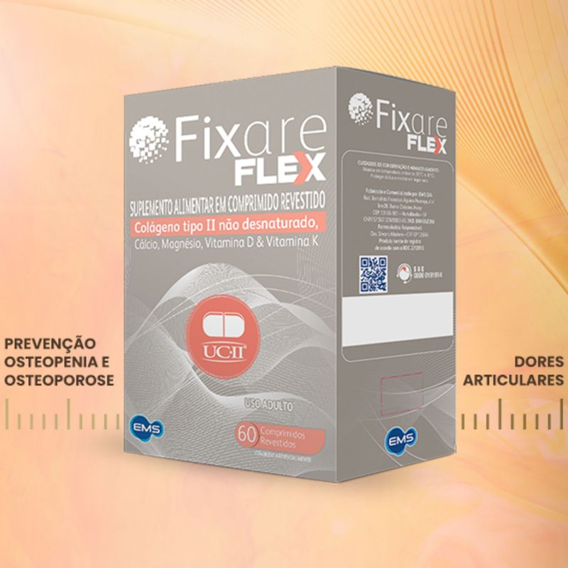 O Fixare Flex é um suplemento em comprimidos prático e fácil de consumir, indicado para uso diário. O colágeno tipo II não desnaturado é um ativo conhecido por sua ação na regeneração da cartilagem articular e no auxílio à mobilidade das articulações, enquanto a vitamina C potencializa a síntese de colágeno e atua como antioxidante. Minerais como zinco e manganês ajudam na manutenção de tecidos conectivos, e o selênio auxilia na proteção celular. A embalagem contém 60 comprimidos, suficiente para dois meses de uso, dependendo da dose recomendada.Composição