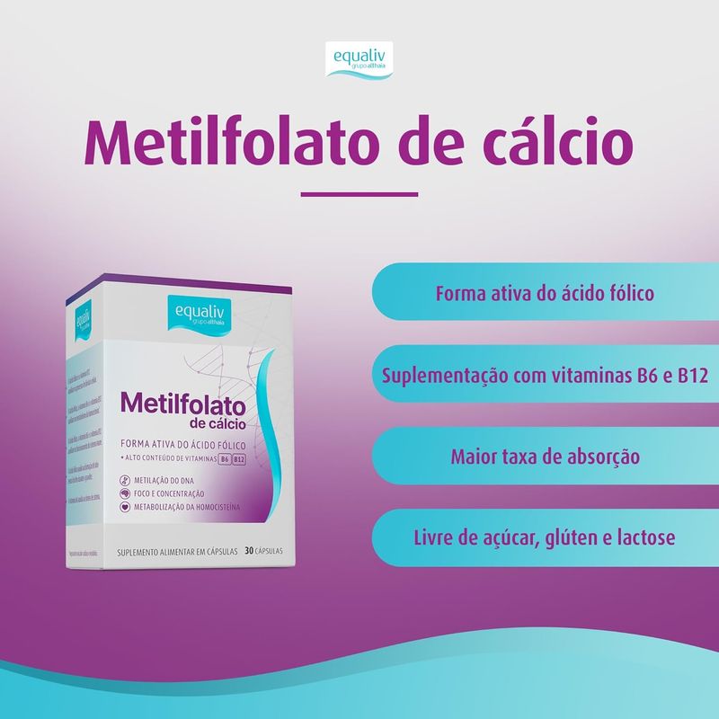 Suplemento Alimentar Metilfolato De Cálcio 30 Cápsulas Equaliv é um suplemento formulado para complementar a ingestão de folato (vitamina B9) na forma ativa. Indicado para adultos, combina metilfolato de cálcio (L-5-MTHF) em 30 cápsulas, contribuindo para o apoio nutricional aos processos de divisão celular e ao metabolismo da homocisteína dentro de uma rotina equilibrada.