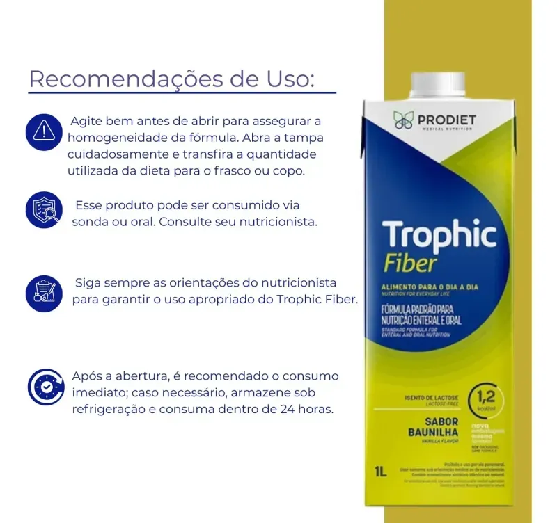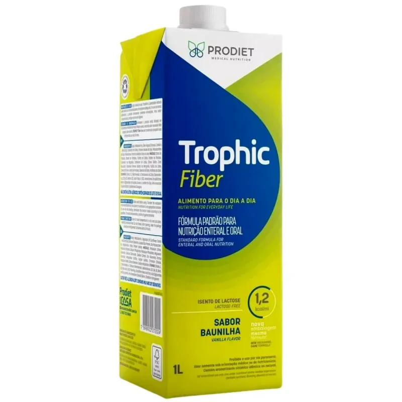 Cada embalagem contém 1 litro do Suplemento de Nutrição Enteral Prodiet Trophic Fiber Sabor Baunilha, pronto para uso. O produto possui densidade calórica de 1,2 kcal/mL e é fonte de proteínas de alto valor biológico, vitaminas e minerais essenciais. Contém fibras que auxiliam na regulação intestinal e na saúde da microbiota. Pode ser administrado de forma oral ou por sonda enteral, conforme recomendação médica ou de nutricionista. É uma fórmula normocalórica, nutricionalmente completa e balanceada, destinada a atender as necessidades diárias de pacientes que demandam suporte nutricional prolongado.