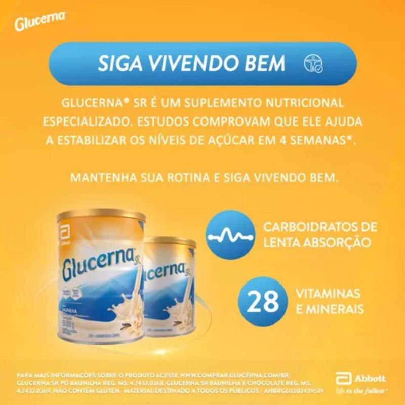 Com tecnologia “slow release”, Glucerna SR combina maltodextrina, proteínas de alto valor biológico e fibras solúveis para promover saciedade e saúde intestinal. Enriquecido com 28 vitaminas e minerais, como cálcio, ferro, zinco, vitaminas A, D, E e complexo B, também inclui ativos funcionais como L-carnitina, taurina e mio-inositol. A fórmula é isenta de sacarose, glúten e contém baixo teor de açúcares. Cada porção preparada oferece 94 kcal e 4,6 g de proteína, sendo ideal para complementar dietas com foco em controle glicêmico e equilíbrio nutricional.