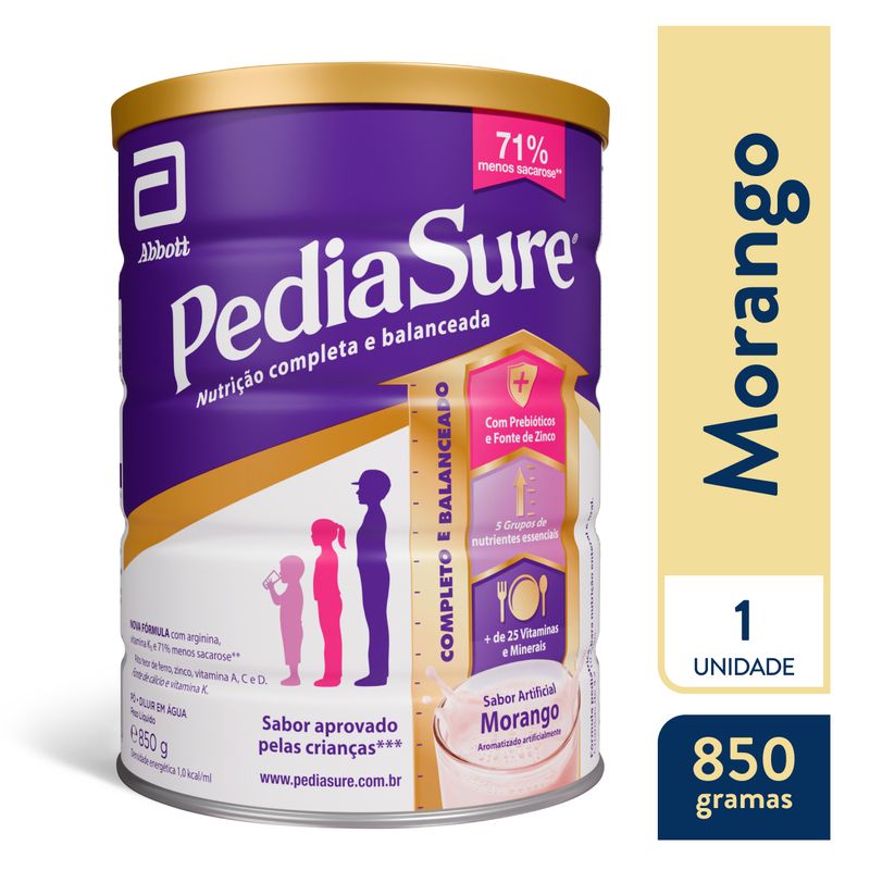 O Pediasure Morango 850g é um suplemento nutricional infantil desenvolvido especialmente para crianças em fase de crescimento que possuem dificuldades alimentares ou não conseguem atingir suas necessidades nutricionais diárias apenas com a alimentação. Formulado pela Abbott, uma das maiores referências em nutrição, Pediasure fornece um equilíbrio ideal de proteínas, carboidratos, gorduras, vitaminas e minerais, essenciais para o desenvolvimento físico e cognitivo infantil. Seu delicioso sabor de morango é bem aceito pelas crianças e torna o consumo mais prazeroso, garantindo energia e nutrição completa em cada dose.