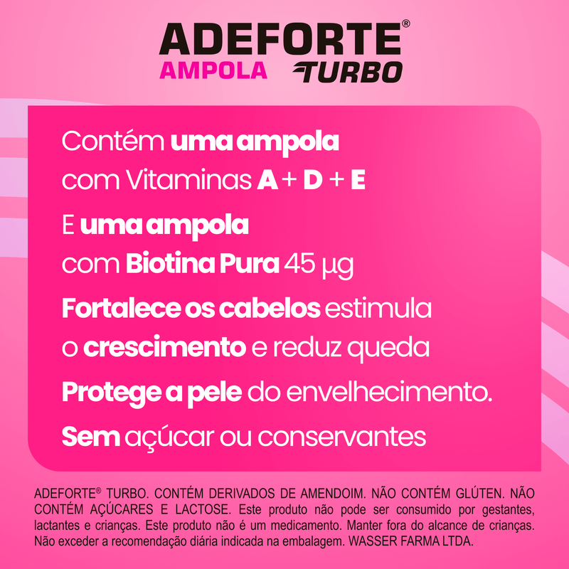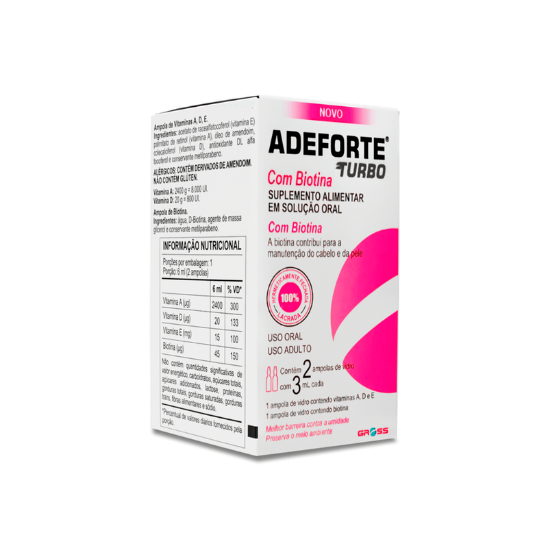 Adeforte Turbo + Biotina é um suplemento vitamínico que combina as vitaminas A (palmitato de retinol), D (colecalciferol), E (acetato de racealfatocoferol) e a Biotina, especialmente formulado para contribuir com a saúde da pele, cabelos, unhas, imunidade e sistema ósseo.