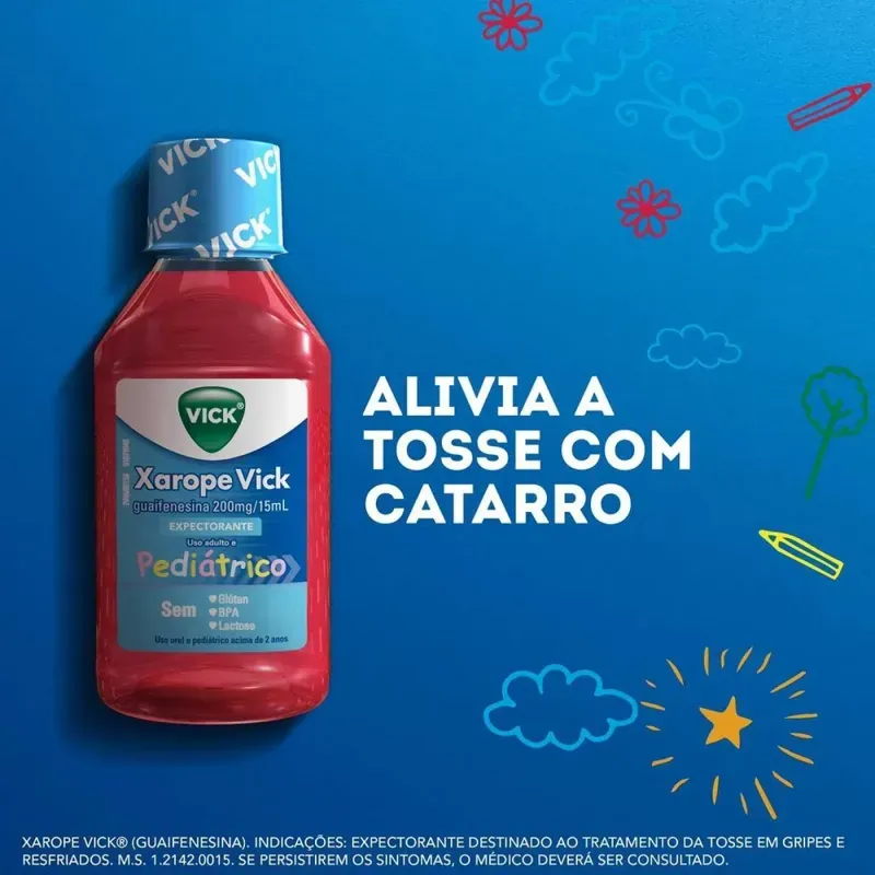 Vick Pediátrico Xarope Expectorante 120ml é um medicamento indicado para auxiliar no alívio da tosse com catarro em crianças, ajudando a fluidificar e eliminar as secreções das vias respiratórias. Sua fórmula foi desenvolvida especialmente para o público infantil, proporcionando ação expectorante que facilita a respiração e contribui para maior conforto durante quadros de gripe, resfriado e irritações respiratórias. O sabor agradável torna o uso mais fácil no dia a dia das crianças.